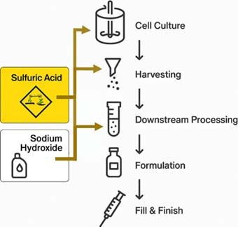 Throughout biomanufacturing, pH must be maintained within narrow ranges to optimize cell growth and product stability. The following stages highlight where pH control is essential and how chemicals like sodium hydroxide (NaOH) and sulfuric acid (H2SO4) are used.- Cell Culture: Maintain pH for optimal cell growth using NaOH to neutralize acids released by organic processes.